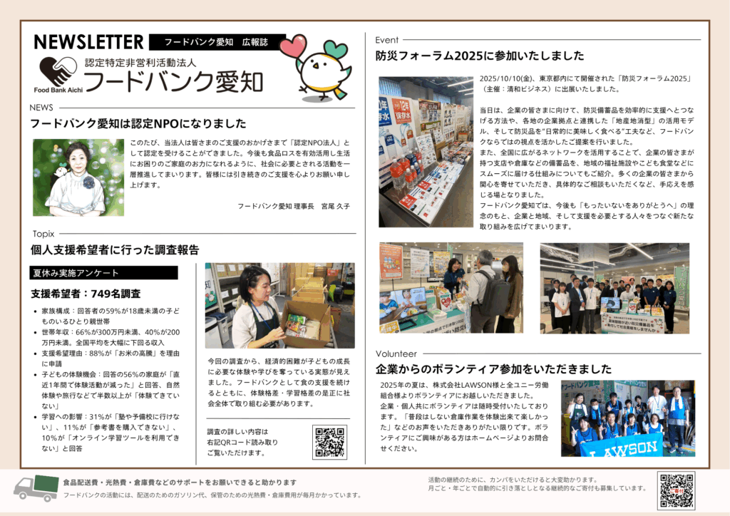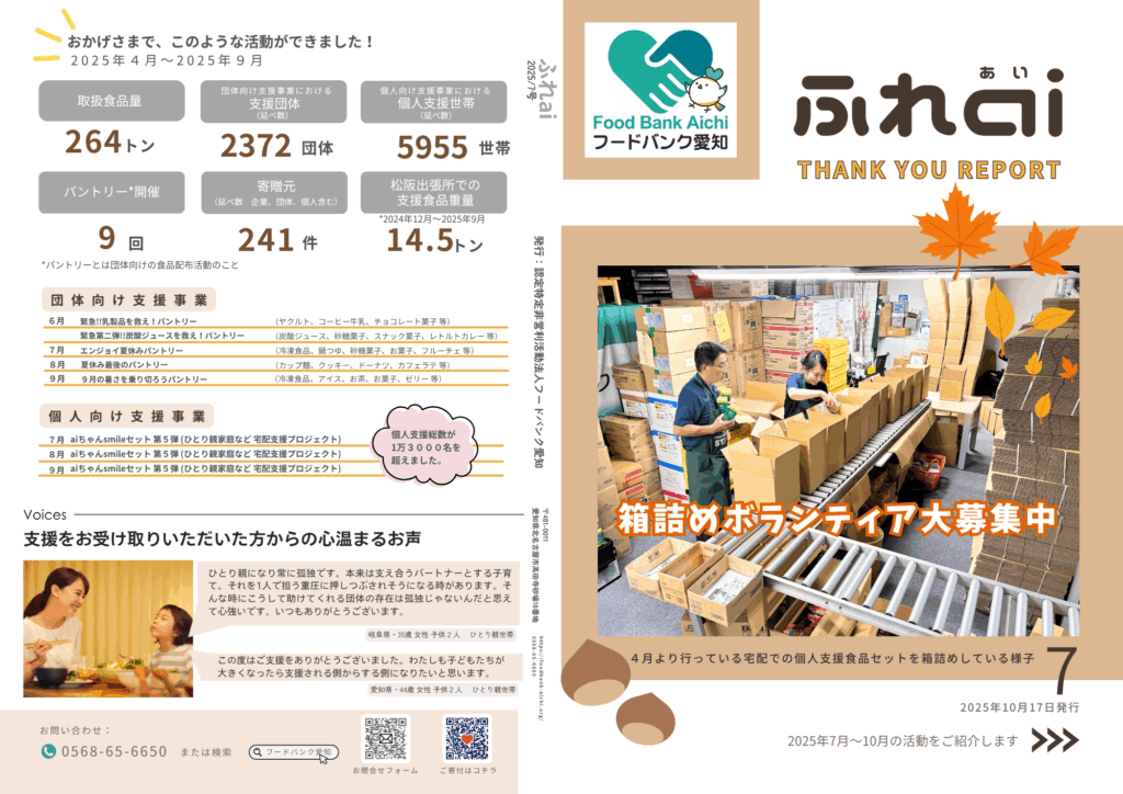 ふれai vol.7(フードバンク愛知 活動報告) 2025年10月21日 最終更新日時 : 2025年10月21日 s.hanai フードバンク愛知の活動報告や寄せられたお声をご紹介します!! ふれai vol.7 印刷完成版ダウンロード