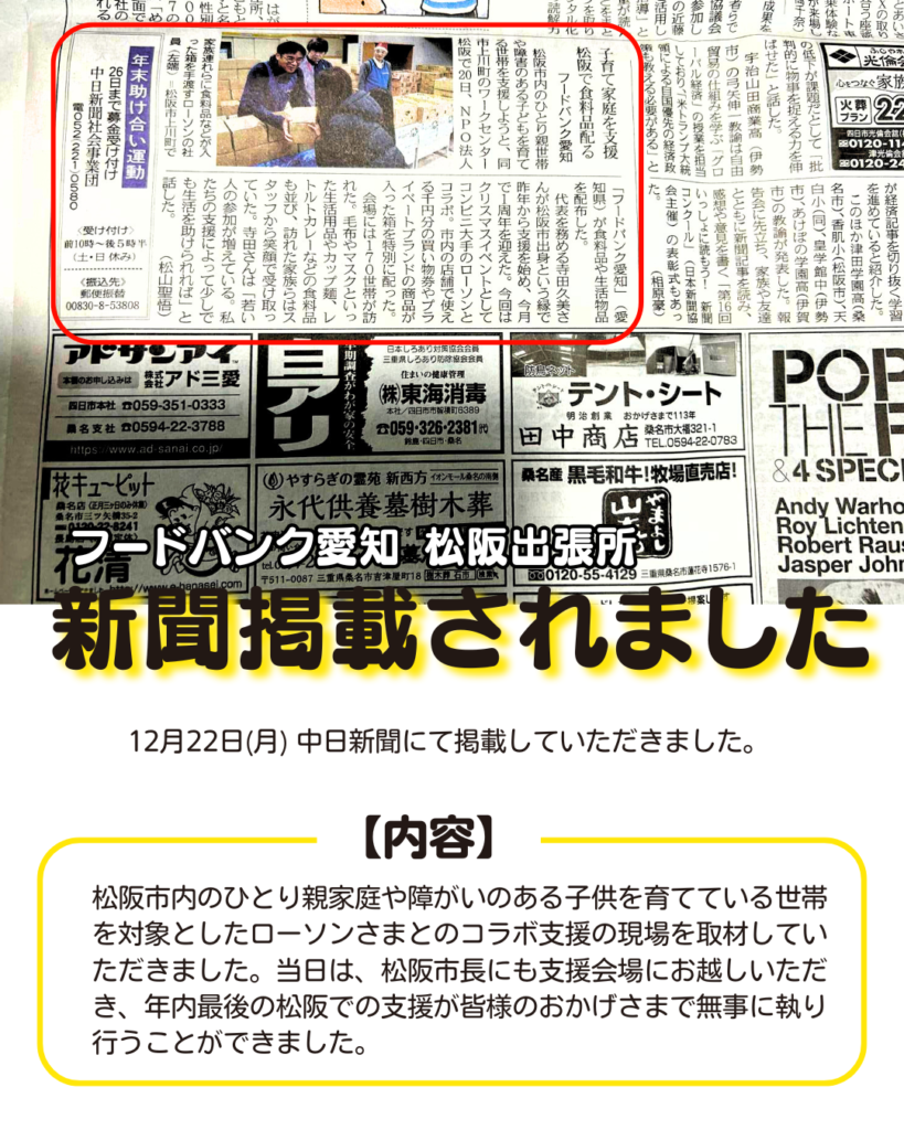 【メディア掲載】「ひとり親家庭など子育て家庭を支援」:中日新聞にて 2025年12月26日 最終更新日時 : 2025年12月26日 s.hanai 中日新聞にて掲載していただきました 2025年12月22日(月)の中日新聞にて、松阪市にて行った支援について取り上げていただきました。