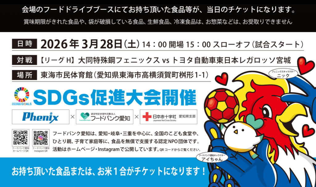 3/28(土)「リーグH 大同特殊鋼フェニックス VS トヨタ自動車東日本レガロッソ宮城」試合会場にてフードドライブ実施のお知らせ